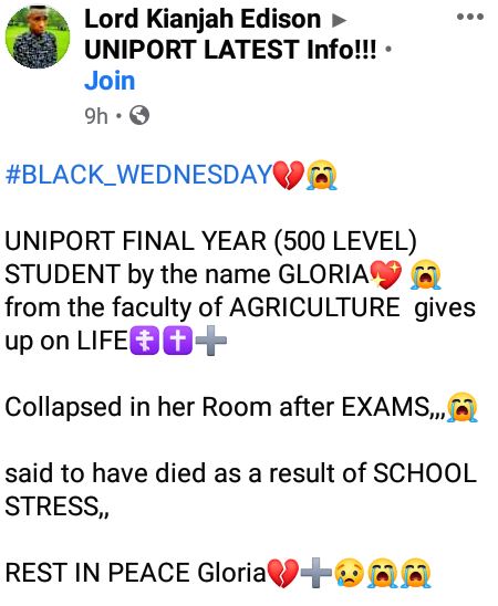 It has been reported that a final year student of the University of Port Harcourt has died.