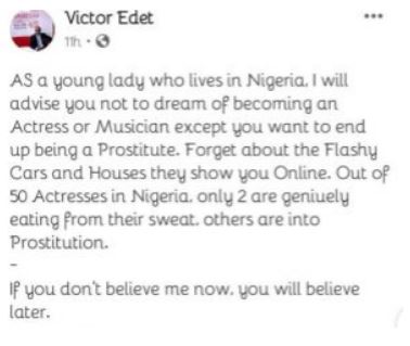 Evangelist Victor Edet said that as a young girl becoming a Nollywood actress has automatically turned you into a Prostitute.