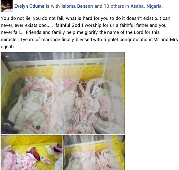 "You do not lie, you do not fail, what is hard for you to do it doesn't exist o. it can never, ever exists ooo..... faithful God I worship for ur a faithful father and you never fail... Friends and family help me glorify the name of the Lord for this miracle.11years of marriage finally blessed with tripplets congratulations Mr and Mrs ogeah," she wrote.