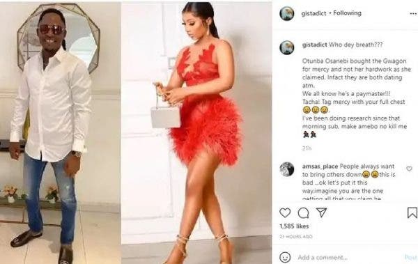 The Instagram blogger Gistadict, revealed that Mercy did not actually buy the car with her own money, but got it as a gift from a member of the Delta State House of Assembly, Otunba Osanebi who she is allegedly having an amorous affair with.