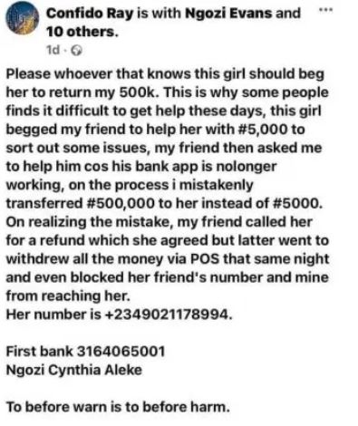 The man identified as Confido Ray has taken to social media platform Facebook to implore well-meaning users of the app to help him locate the lady after she refused to refund the money which was erroneously paid into her account.