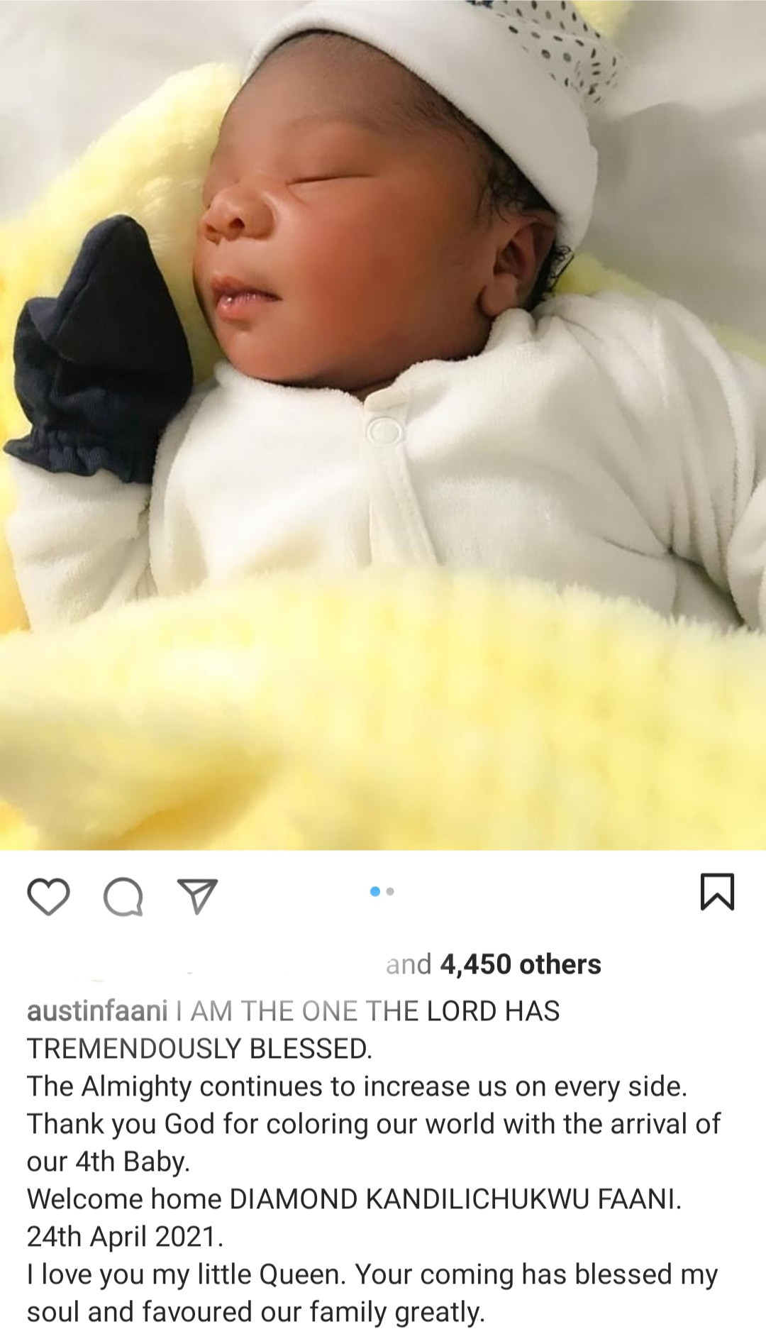 Popular Nigerian actress, Chacha Eke-Faani and her husband, Austin Faani, have welcomed their 4th child.