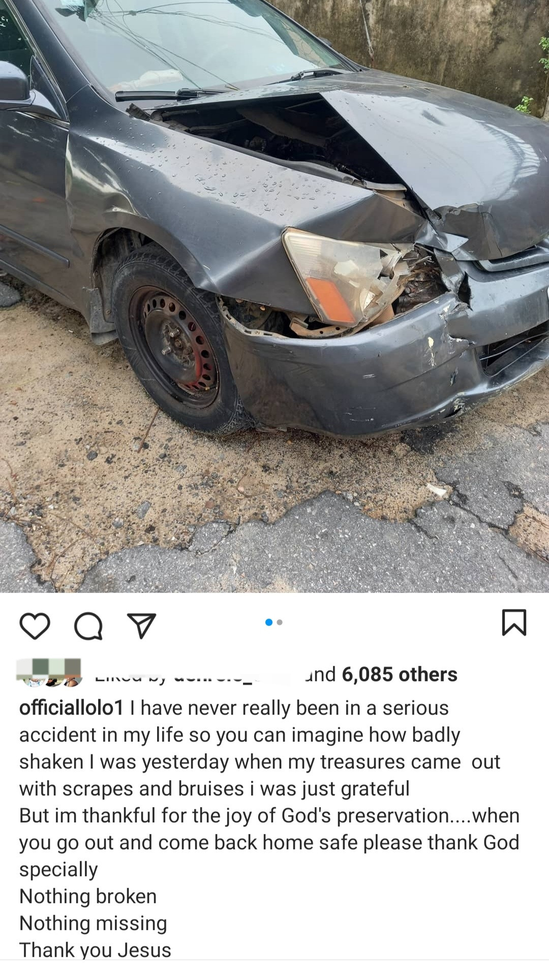 Omotunde Adebowale-David, the Nigerian media personality who is better known as Lolo 1, has thanked God for saving her and her children from an accident.