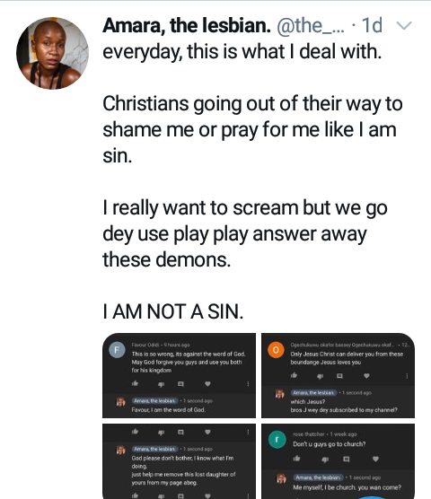 "Turned aeveryday, this is what I deal with. Christians going out of their way to shame me or pray for me like I am sin. I really want to scream but we go dey use play play answer away these demons. I AM NOT A SIN" she wrote.