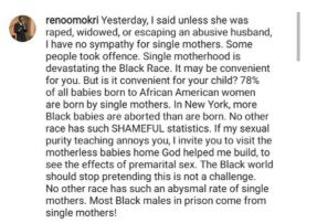 ''Yesterday, I said unless she was raped, widowed, or escaping an abusive husband, I have no sympathy for single mothers. Some people took offence. Single motherhood is devastating the Black Race.