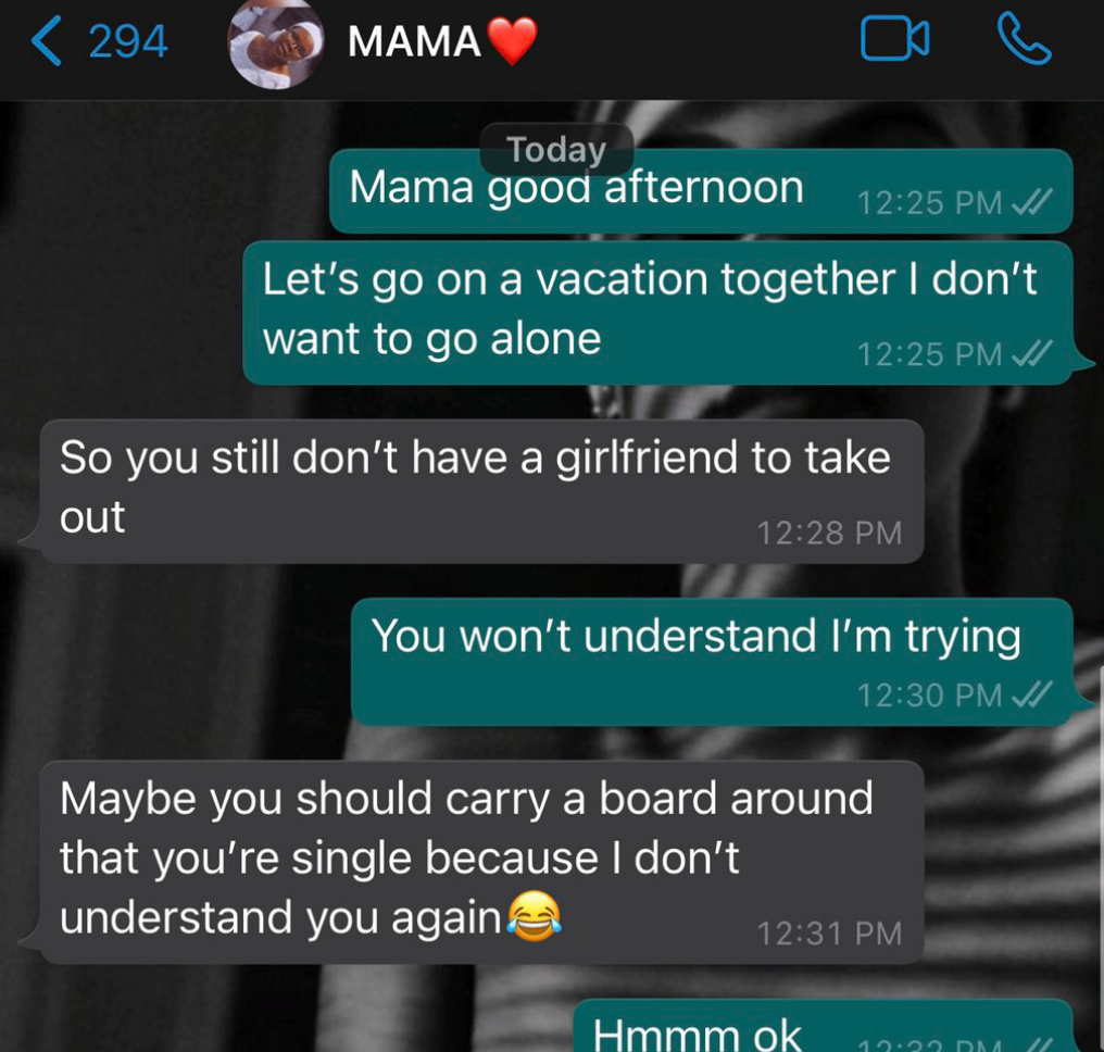 Ugly Mofo shared a screenshot from the conversation he had with his mother. In the WhatsApp conversation, he told his mother to accompany him on a vacation. His mother replied him by asking him if he doesn't have a girlfriend.