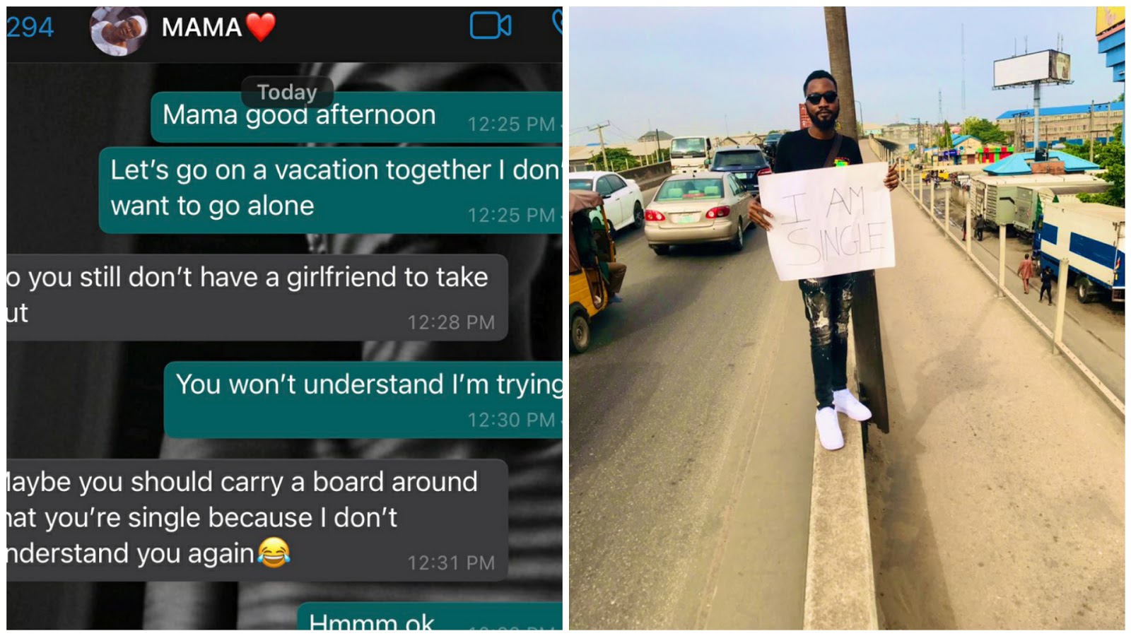 He replied his mother by telling her that she won't understand. His hilarious mother then told him to take to the streets and look for a girlfriend. Kay has taken his mother's advice serious as he took to the streets of Lagos with a placard in his hands, which reads, "I'm single."
