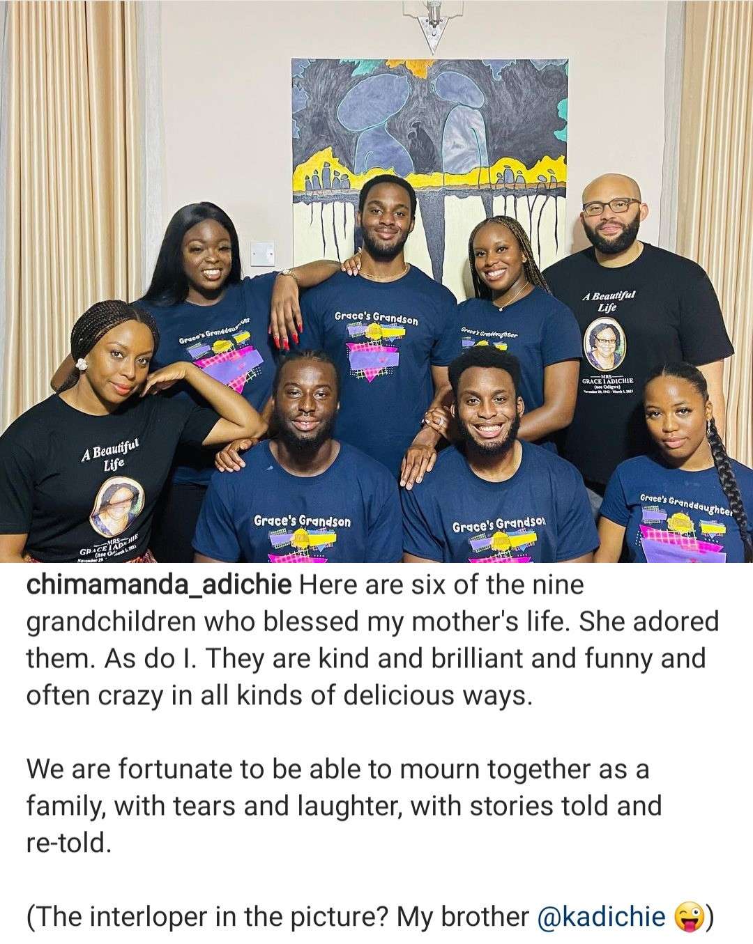 Chimamanda captioned the photo: "Here are six of the nine grandchildren who blessed my mother's life. She adored them. As do I. They are kind and brilliant and funny and often crazy in all kinds of delicious ways. ?