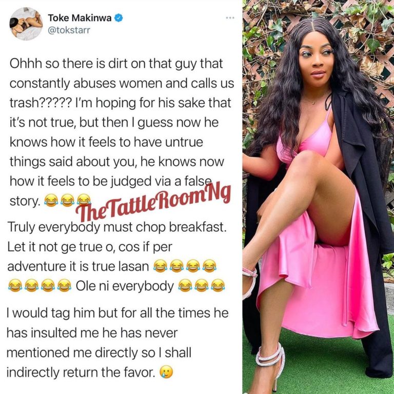 Though he has come out to deny such rumour, Toke Makinwa has decided to poke fun at him via a series of tweets on her Twitter handle.