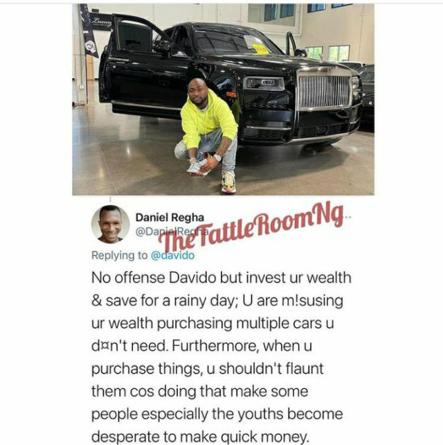 Condemning Davido, a Twitter user identified as Daniel Regha knocked the singer for flashing his wealth unnecessarily and investing in vanity rather than in profitable businesses.
