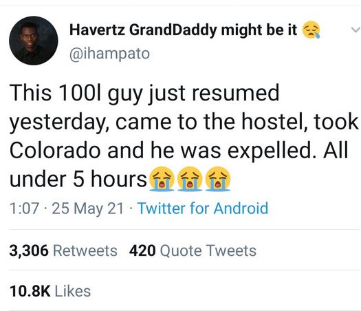He tweeted: "This 100l guy just resumed yesterday, came to the hostel, took Colorado and he was expelled. All under 5 hours.
