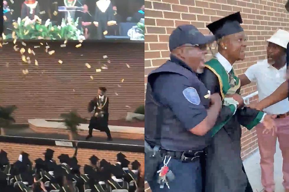 Police handcuffed the 18-year-old and escorted him out of the commencement ceremony. He was detained for attempting to 'start a riot and disorderly conduct', and ticketed for the offense.