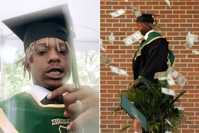 The rapper who graduated from Langston Hughes High School in Atlanta on Friday last week, celebrated by pulling out $10,000 in cash and throwing it all over the stage.