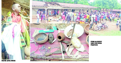 Saturday Sun gathered that members of the community, mainly youths, on noticing all these items, and coupled with allegations already levelled against the purported man of God, paraded him round the community amidst torture. They hung palm fronds on his body; sang and booed him in their native way as a means of atonement for the alleged sacrilege. The crowd was marching him out of the community with a stern warning never to set his foot there again when the police reportedly intervened.