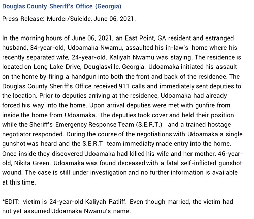 Deputies also found the bodies of Nwamu’s estranged wife, 24-year-old Kaliyah Nwamu, and her mother, 46-year-old Nikita Green.