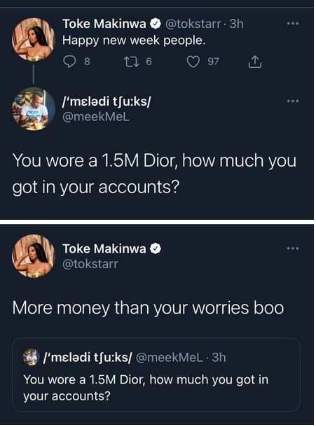 In the comment section of a tweet she shared, a follower who noted that she wore an expensive Dior outfit asked Toke how much she has in her account.