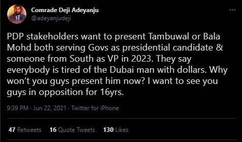 He wrote: “PDP stakeholders want to present Tambuwal or Bala Mohd both serving Govs as presidential candidate & someone from South as VP in 2023.”