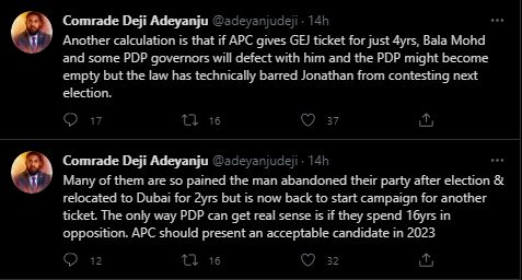 “Another calculation is that if APC gives GEJ ticket for just 4yrs, Bala Mohd and some PDP governors will defect with him and the PDP might become empty but the law has technically barred Jonathan from contesting next election.”