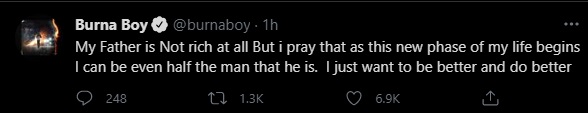 Burna Boy in his post on Twitter has excitedly revealed that he is turning 30 years old in a week. In his tweet, he had prayed to be half the kind of man his father is as he steps into a new phase of his life.