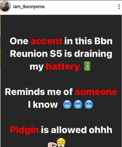In a post shared on his Instagram page, Ike, who seem sarcastic, said one of the accents in the ongoing BBNaija reunion is draining his battery, and this reminds him of someone he knows.