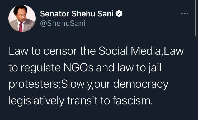 'Bill to Jail Protesters, Censor Social Media and Regulate NGOs' - Shehu Sani Cries for Nigeria