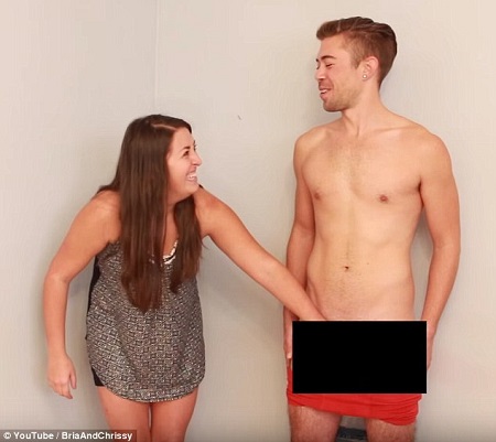 Bria Kam, one half of the singing group, was one of the volunteers who decided to get up close and personal with with a guy's package for the first time, while the camera was rolling.