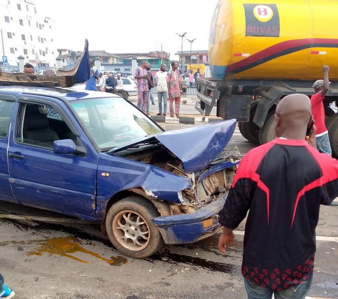 There was an accident as a tanker crushed six cars in Challenge Area of Ibadan, Oyo State after the driver lost control of the vehicle around 7am on Tuesday.