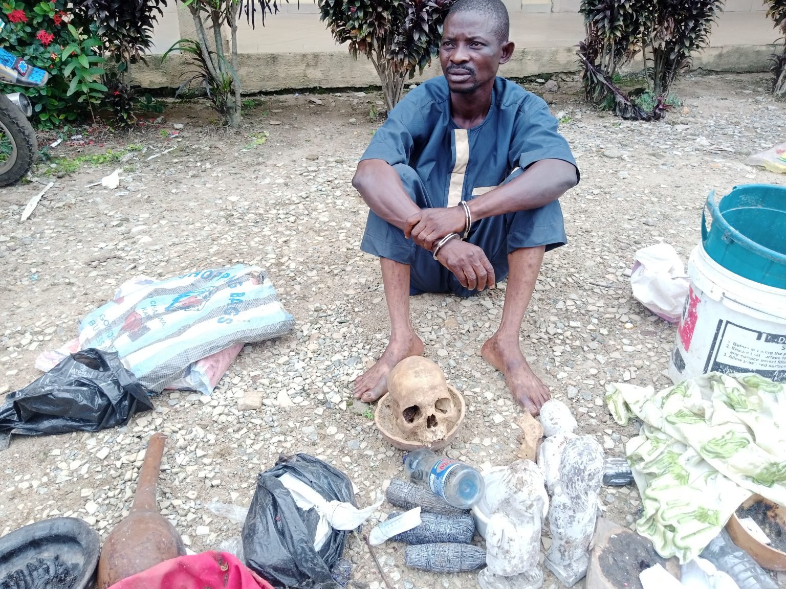 Parading the suspects at the state police command n Osogbo, the State Commissioner of Police, Olawale Olokode, said the herbalist, Oyewo was apprehended along Ile-Ife/Ibadan road with one human skull, snail and voodoo.