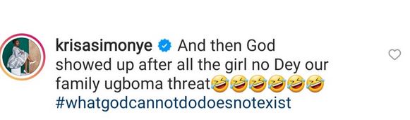 His wife, Kris, responded, saying that God showed up despite all his threats of "girl no dey our family".