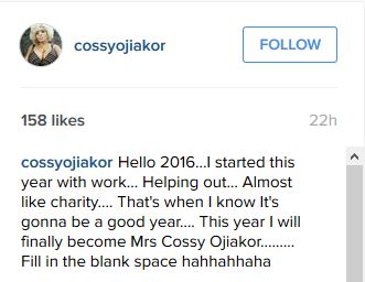 Busty Nollywood actress, Cossy Ojiakor took to her Instagram account to announce that she will be getting married sometime this year, 2016.