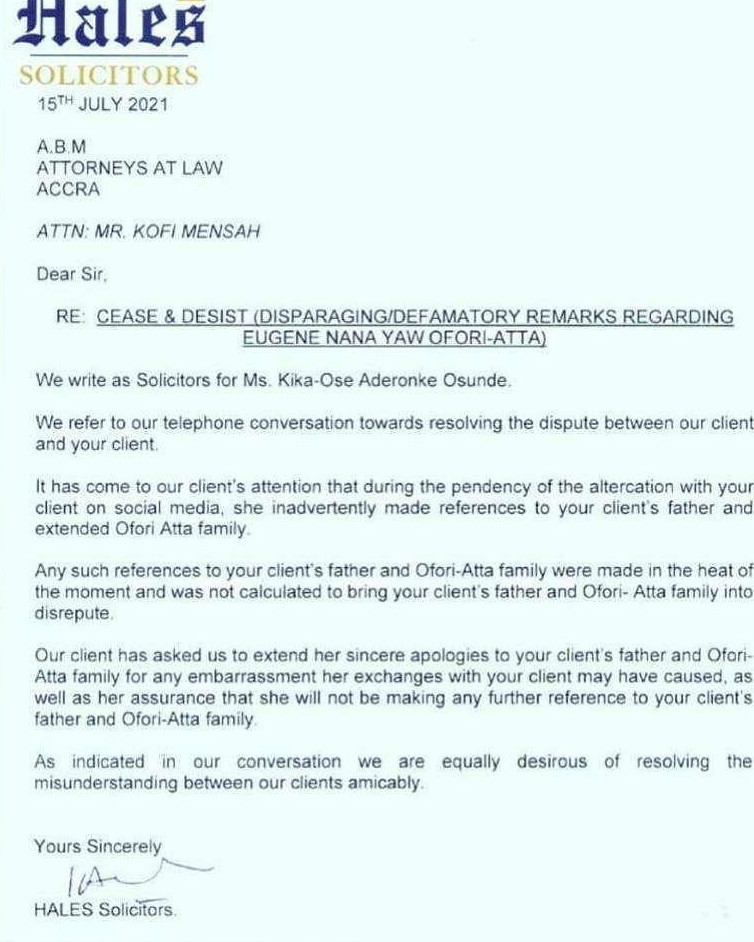 Her lawyers later issued a letter of apology to the Ofori-Atta family but that didn't seem to calm things down.