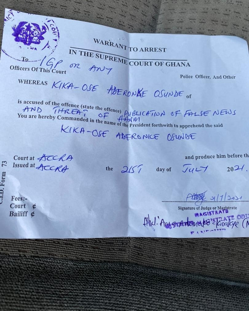 Five days later, on Wednesday, July 21st, the police issued a warrant of arrest for her.