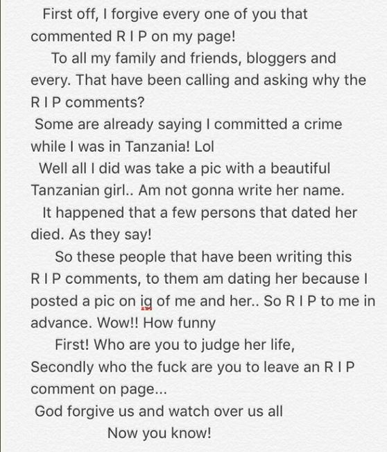 These actions prompted some Tanzania fans to start commenting RIP (Rest In Peace) on the picture he took with Gigy which was posted on his Instagram page. The most confusing part of the comments was that it was done in Swahili which is not understandable to Tekno.
