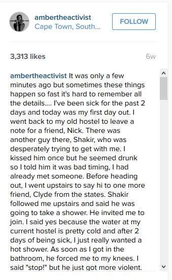 In her candid post, Amber explained that she had returned to a hostel that she previously stayed at after a two day bout with food poisoning to leave a note for her friend Nick when she ran into Shakir who was trying to 'get with' her.