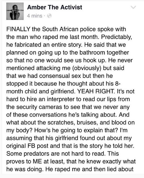 'I have all those f****d up feelings that we get after r*pe...shame, disgust, suffering,' she wrote. 'I'm here, alone, and any DNA has been wiped away in the shower. The South African police will just roll their eyes when I walk in. Feeling sicker than ever now.'