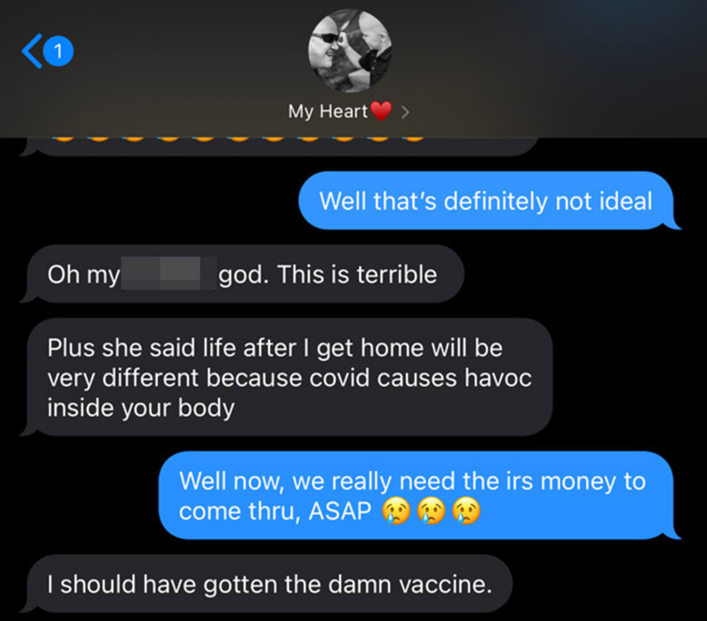 He reportedly sent his fiancée a heartbreaking text, which read: "I should have gotten the damn vaccine" just before he died.