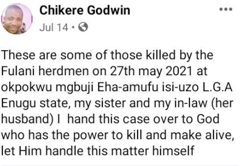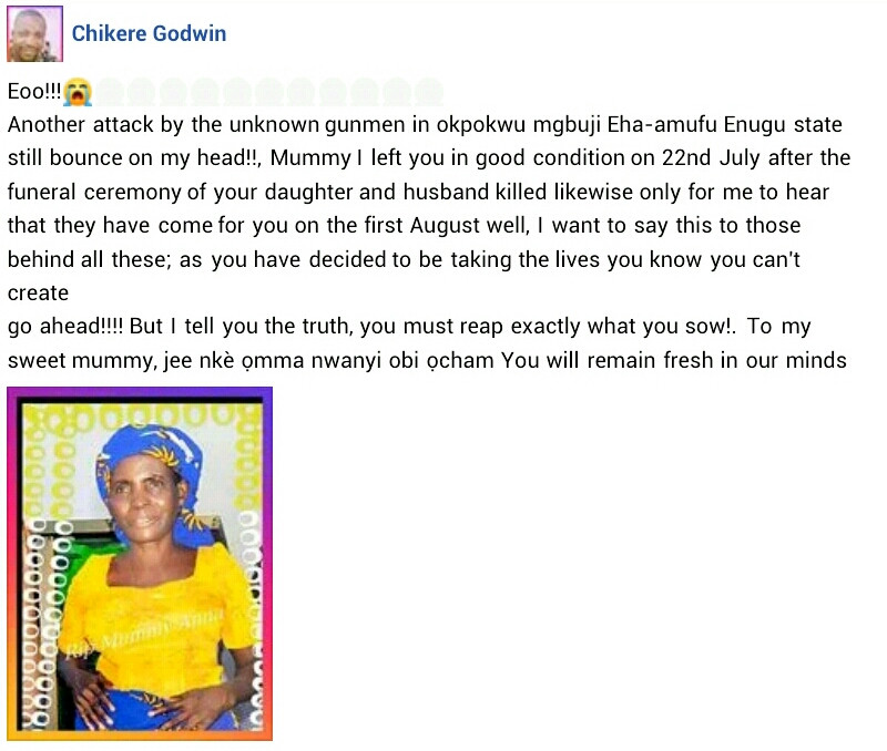 The deceased was said to have recently buried her daughter, Chinyere Ede and son-in-law, Japhet Ede, who were killed in earlier attack carried out by herdsmen in the community.
