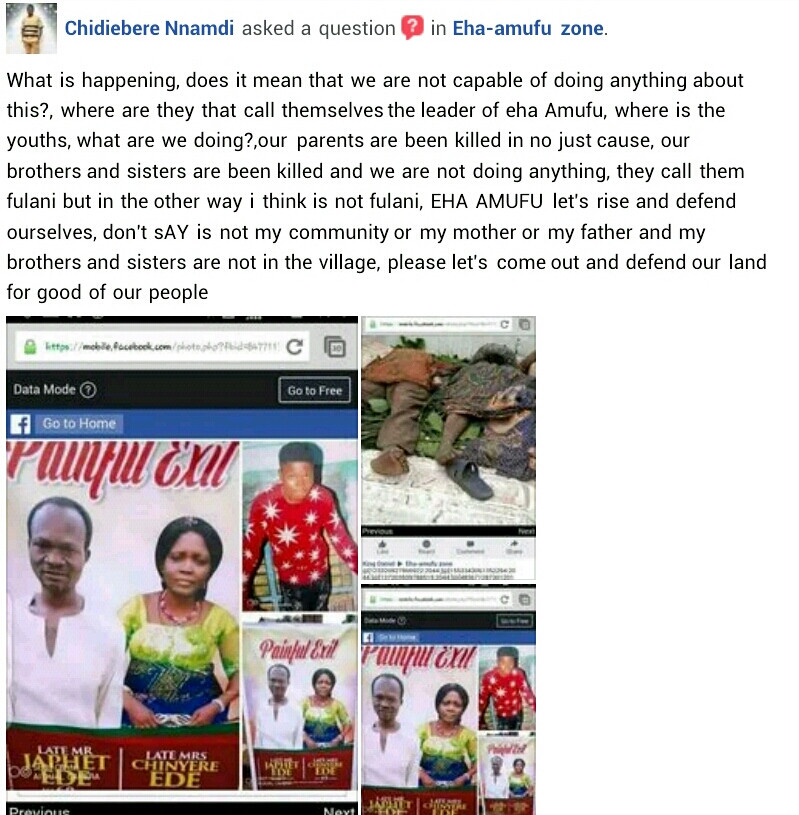 In what will come across as a really shocking development, an elderly woman who has been identified as Mrs Anna was among eight people killed by suspected Fulani herdsmen at Okpokwu Mgbuji community in Eha-Amufu, Isi-Uzo Local Government Area of Enugu State, on Sunday, August 1.