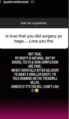 “My booty is natural. But my boobs, teeth and skin complexion are fake. In fact, hopefully after delivery, I’d want a smaller booty. Honestly, it’s too big. I don’t like it."