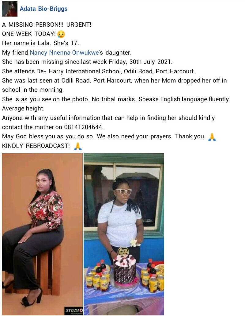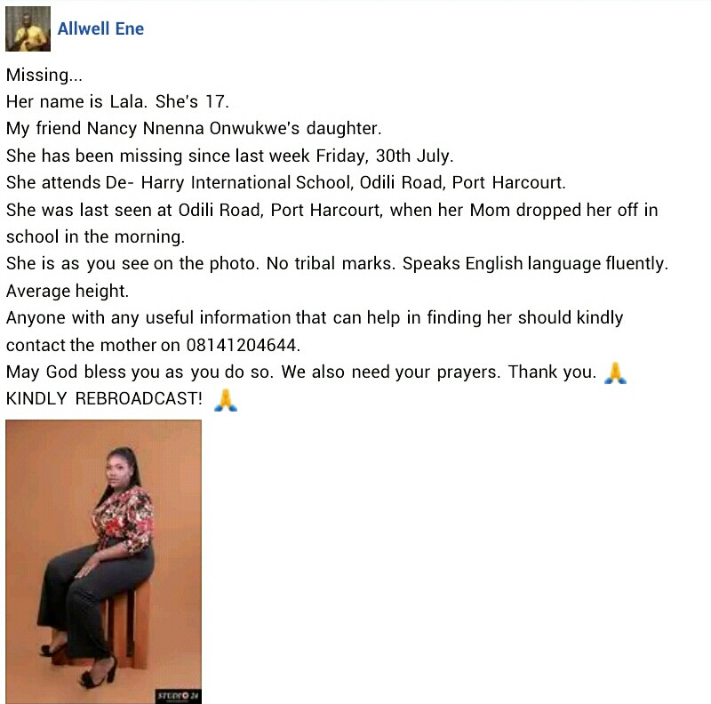 The teenager has been missing since Friday, July 30th, after her mother, Nancy Nnenna Onwukwe, dropped her off at her school in Odili Road, Port Harcourt.