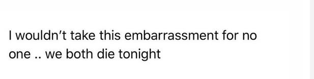 One of the messages allegedly sent to Shyngle by Bala Gaye reads: "I wouldn't take this embarrassment for no one. We both die tonight. "