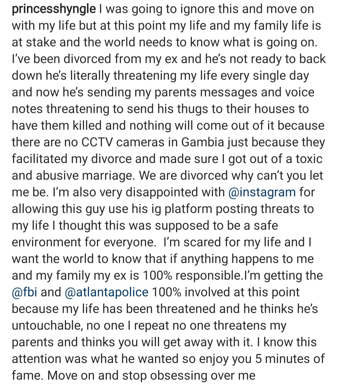 Princess Shyngle, the popular Gambian actress, has taken to Instagram to allege that her life is being threatened by her ex-husband.
