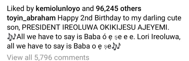 “Happy 2nd Birthday to my darling cute son, PRESIDENT IREOLUWA OKIKIJESU AJEYEMI …”