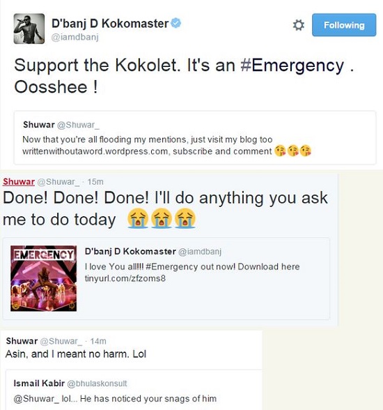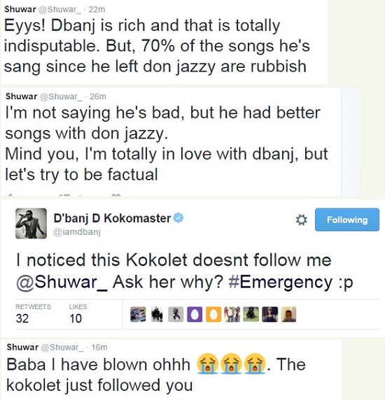 A Twitter user that goes by the handle @shuwar slammed the Kokomaster, D'banj and his reaction is worthy of being praised.