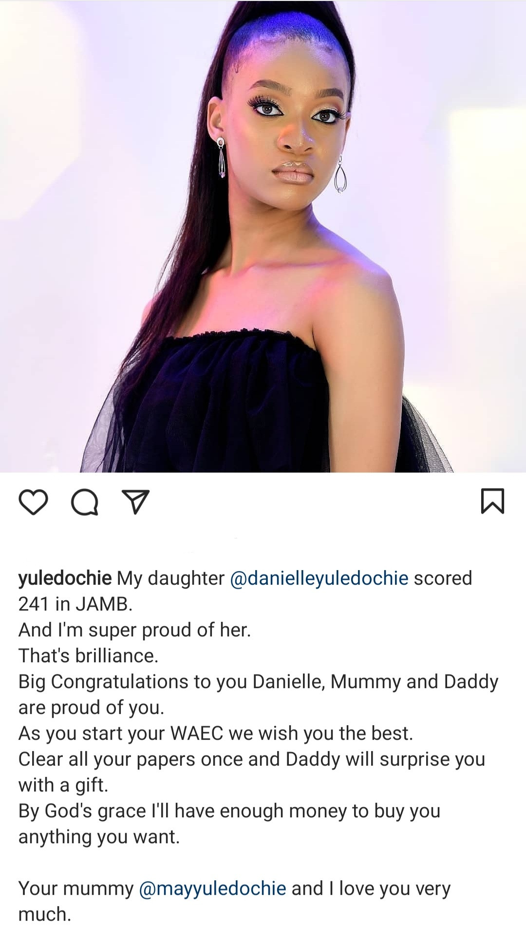 Yul Edochie has taken to social media to applaud his daughter for scoring 241 in the JAMB examination.