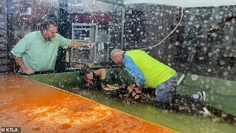 Fortunately, one of the visitors, now identified as Donnie Wiseman, 48, jumped into the water and climbed on top of the reptile in an effort to free the handler from its jaws.
