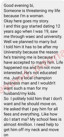“I and this guy started dating 12 years ago when I was 19, saw I was 19, saw me through WAEC and university. Well, we planned to marry but I told him it has to be after my University because the reason he’s training me is because I have accepted to marry him. Life happened and I’m not more interested. He’s not educated and a local champion…”