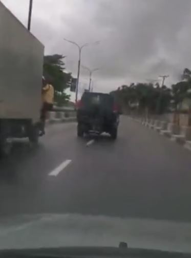 The moment an official of the Lagos State Traffic Management Authority fell off a moving truck while trying to arrest the driver, has gone viral.