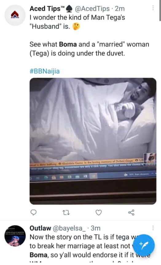 Many Nigerians on social media have taken to pages and handles to react to a trending video of Boma and Tega under the duvet during lights out.