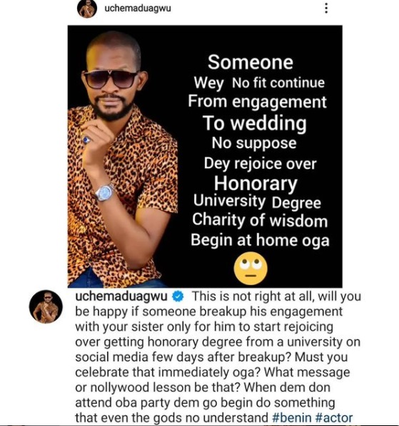 Uche Maduagwu has thrown a shade at his colleague, Alexx Ekubo after his fiancee called off their engagement.